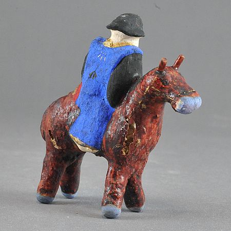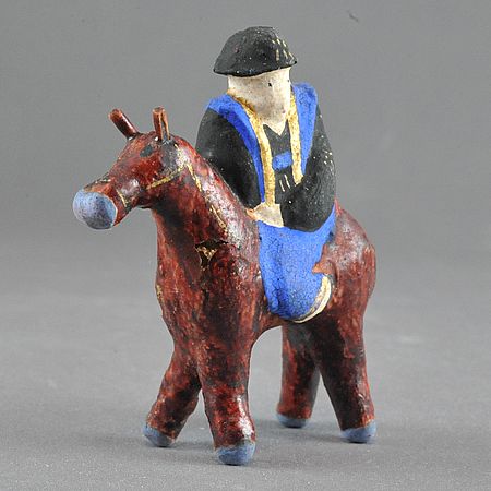 | 吉良の赤馬の中でも陣笠をかぶった吉良の殿様が乗った図柄の作品 領民に慕われた名君として領地を見回った藩主の姿を描いている 殿様が乗ったものは6代目の田中ゆき子さんの代からとのことである 高さ70mm |