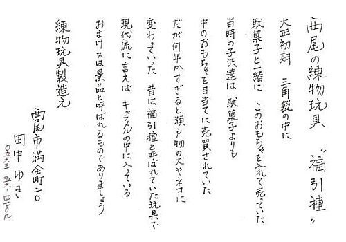 西尾の練物玩具「福引種」の栞(左)には 大正初期と記されている 斎藤良輔(1971)では吉良の赤馬は明治末に姿を消し、 昭和になって復活したとあるが、 練物は福引種としては 大正期も制作されていたことがうかがえる これもいったん途絶えたが田中ゆき子によって復元された 福引種 (えびす、大黒、ほてい、獅子頭、鬼、狐、鶏、 おしどり、せみ、蛙の10種類) |