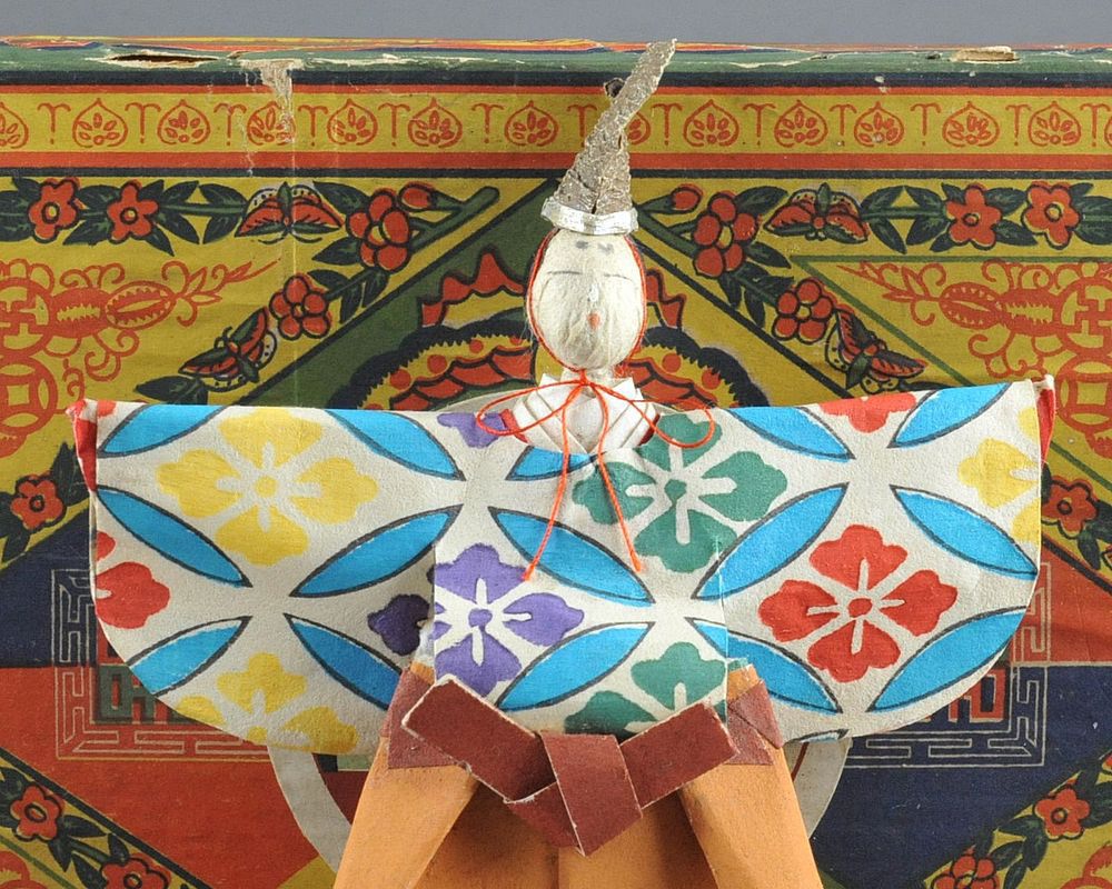 | 男雛は破損がないが髪は女雛と同じ材質でできているので要注意 着物は千代紙だが袴と帯は彩色されている |