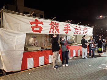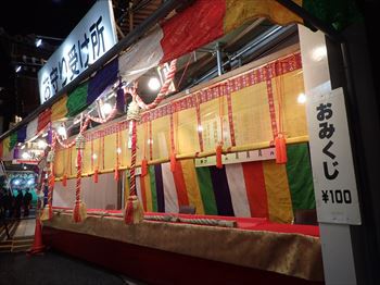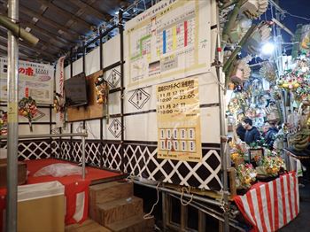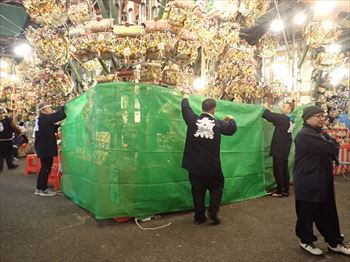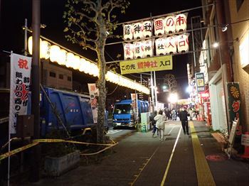 古い熊手は納所に戻されるが お祓いしたとはいえ清掃回収車で 集められて処分されていくのは物悲しい 露店もいったん店を閉じて 休憩モードに入っているところが多い 露店の稼ぎ時は夜が明けてからである |