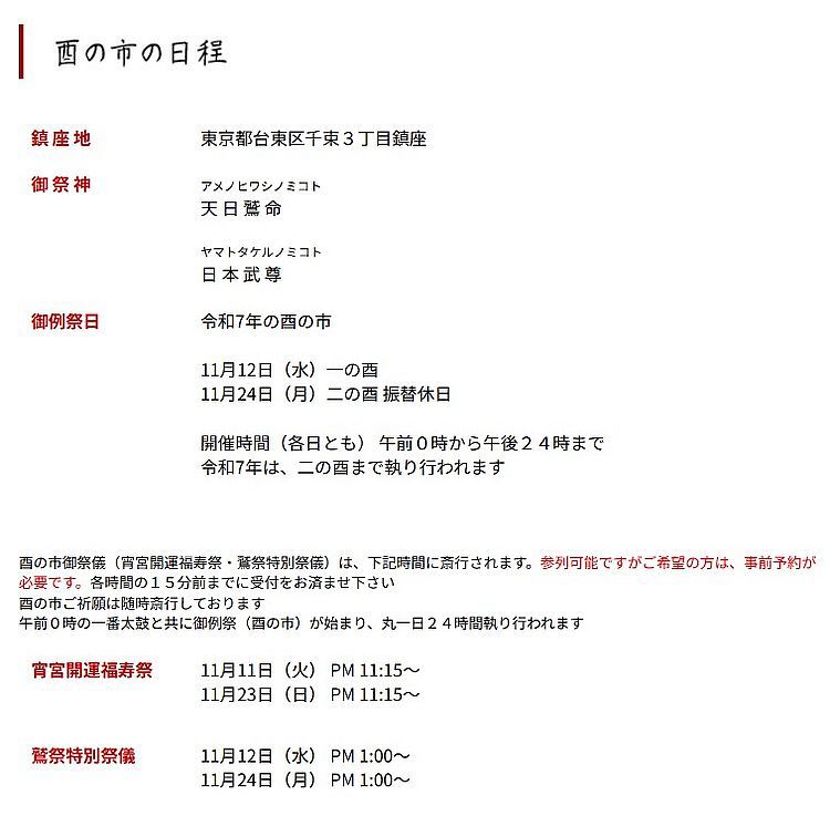 本年は一の酉が11月12日(水)、二の酉が11月24日(火 振休)という日程になっている。行事としては前日の23:15の宵宮祭から始まる。