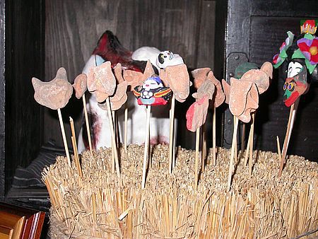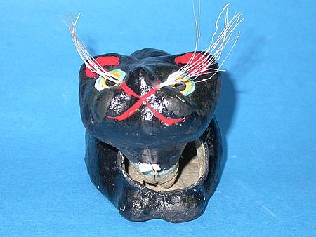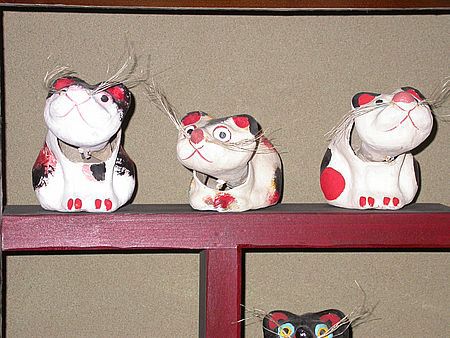 首ふり十二支の派生であろう紙張り子の首振り猫 姿勢もいろいろとある ひげは麻で出来ている 右画像が首ふり十二支だが子から寅が 画面から外れてしまっている 首ふりカエルもある |