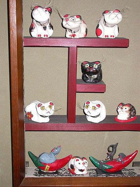 招き猫ではないが、手びねりの土人形の猫もよく見かける。これもいろいろな種類がたくさんある。また下総の首人形の中にも猫がある。