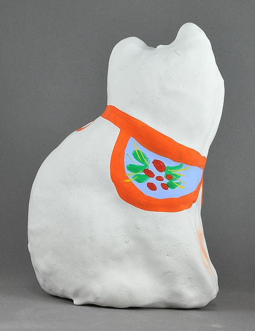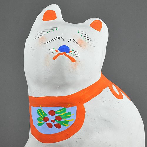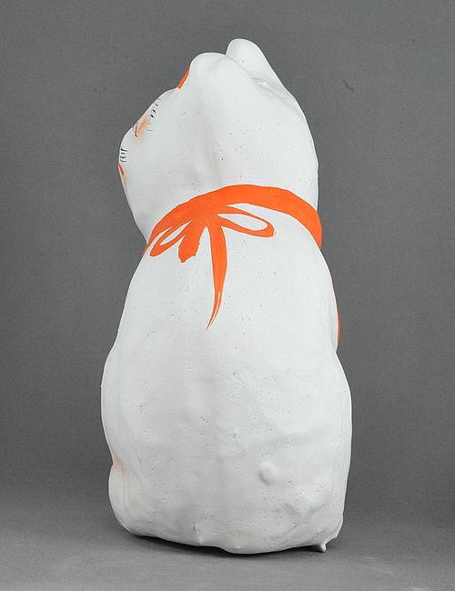 高さ205mm×横120mm×奥行105mm 模様なしの白猫 右手上げの常滑タイプの形状 大きな目にサーモンピンクの鼻 ひげは立派だが眉毛はない 千萬両の小判抱き 赤の首玉に金の鈴、青緑系の前垂れで松竹梅の柄が入る 手足の先には金と赤の彩色がある 金の部分は肉球か? 眉毛がないので猫の額が広い その後、猫の色のバリエーションも増えている |