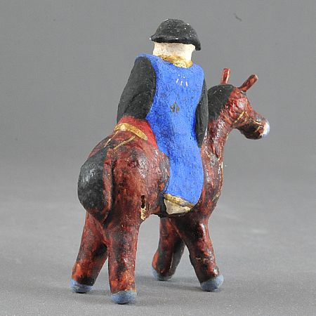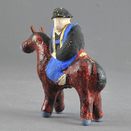 | 吉良の赤馬の中でも陣笠をかぶった吉良の殿様が乗った図柄の作品 領民に慕われた名君として領地を見回った藩主の姿を描いている 殿様が乗ったものは6代目の田中ゆき子さんの代からとのことである 高さ70mm |