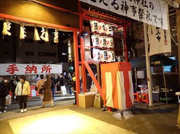 古い熊手は納所に戻されるが お祓いしたとはいえ清掃回収車で 集められて処分されていくのは物悲しい 露店もいったん店を閉じて 休憩モードに入っているところが多い 露店の稼ぎ時は夜が明けてからである |