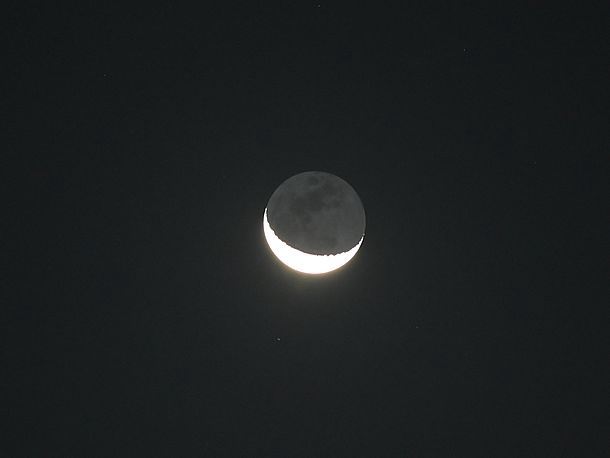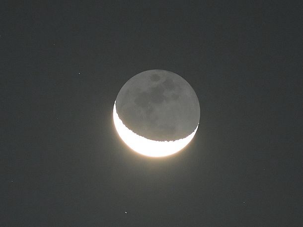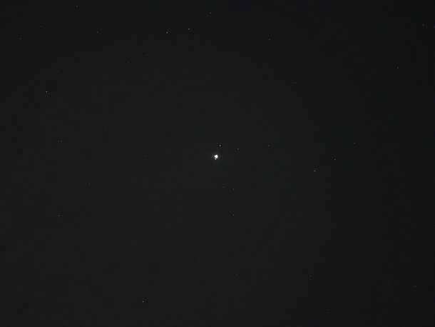 月のクレータ壁に当たった光がカプスとして見えている。月の左下に見えている恒星はかなり離角の大きな二重星のようだ。