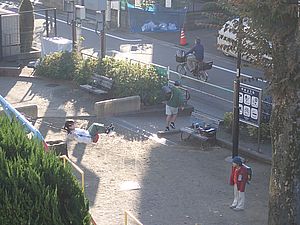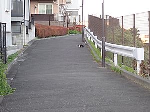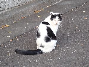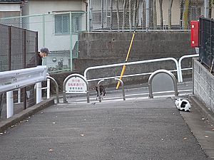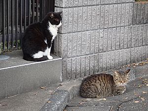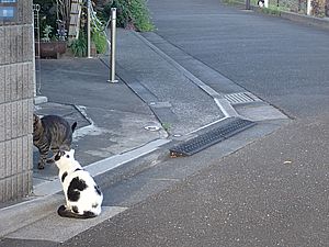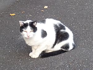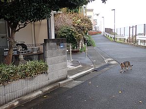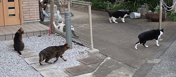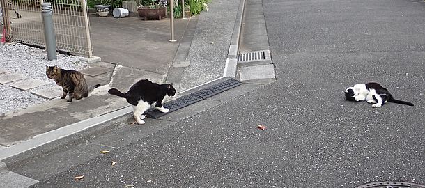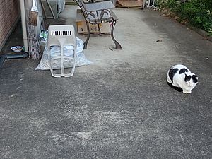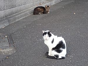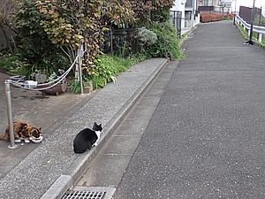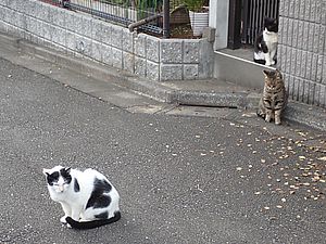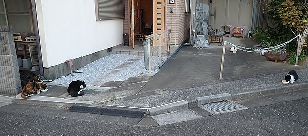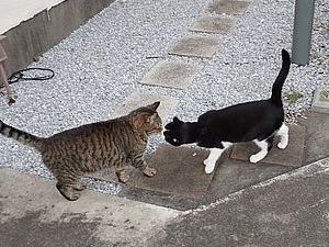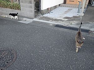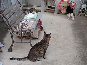 元祖黒トラとマルハチ君の視線の先にはあご黒がいる。通過するおばさんは無視されていた。