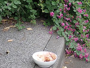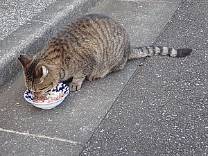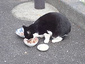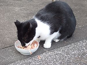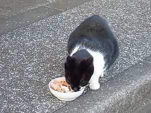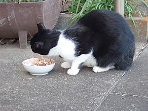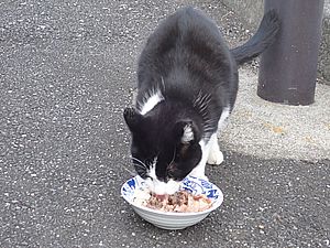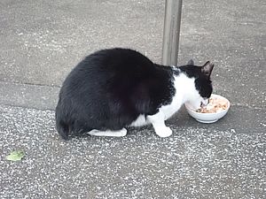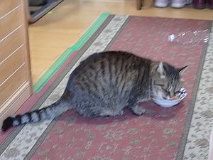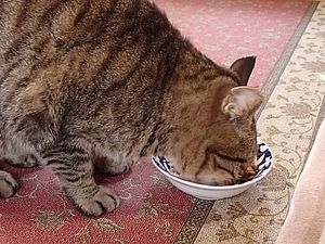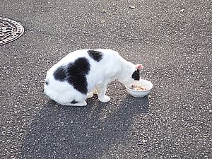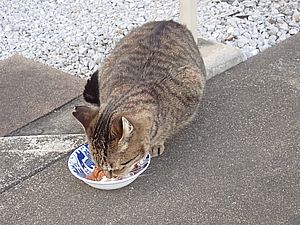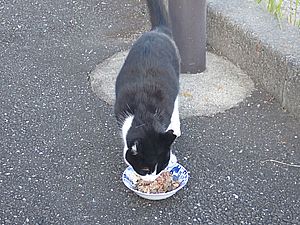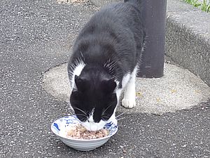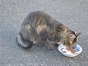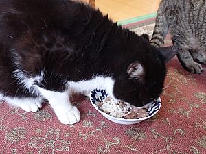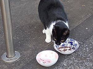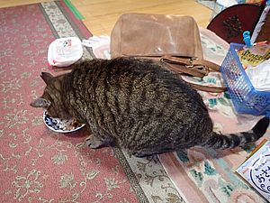ファントム君がガチャミケにエサを盗られた。ファントム君には花がつおトッピングで新たに与える。