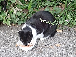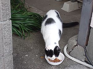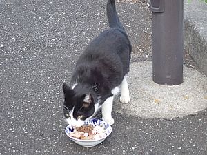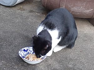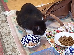 カリカリの残りをガチャミケが食べている。遅刻していつも間にかやってきた黒トラ2号がカウ君のエサを食べていた。