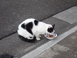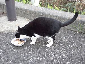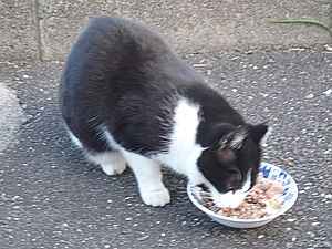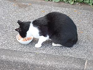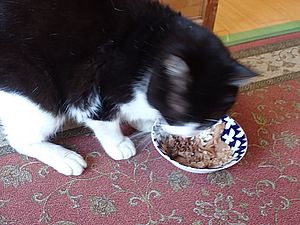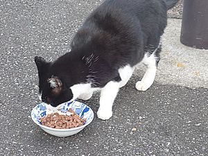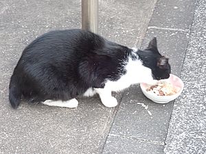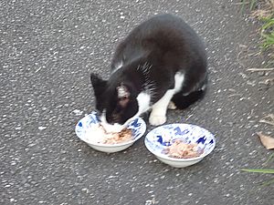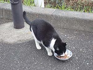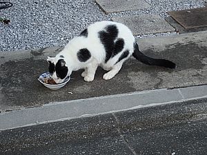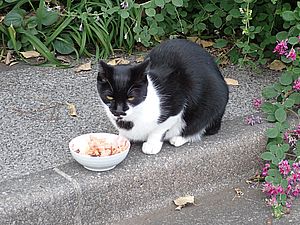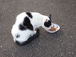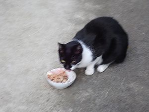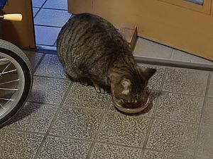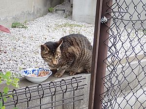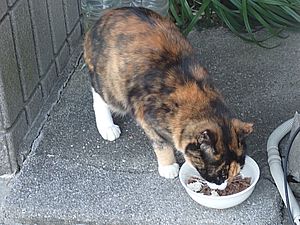他のエサが気になるガチャミケ。他猫の餌はうまく見える。