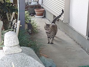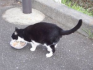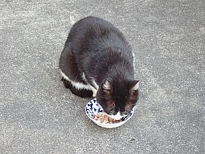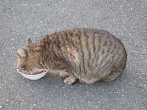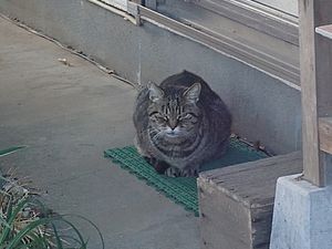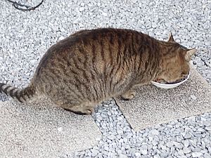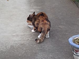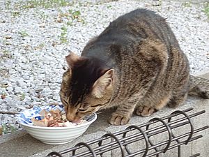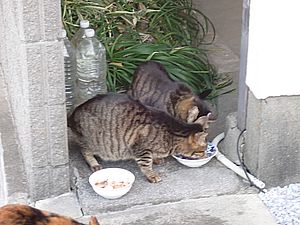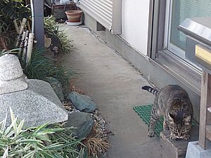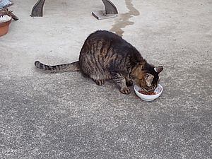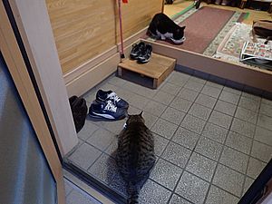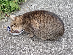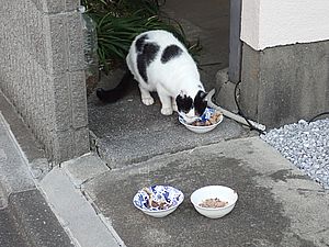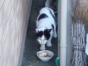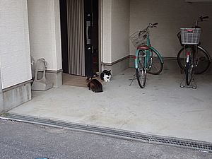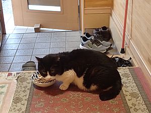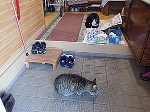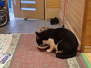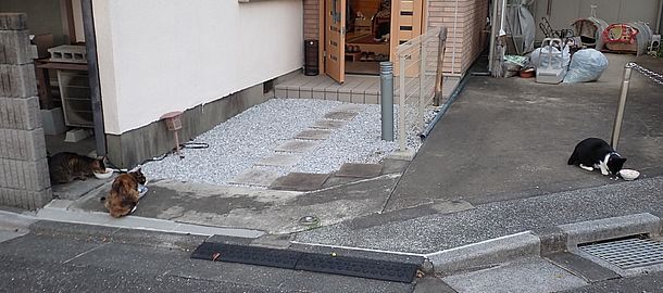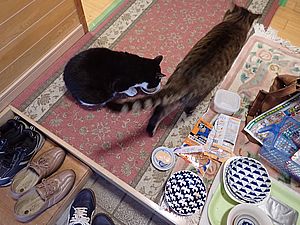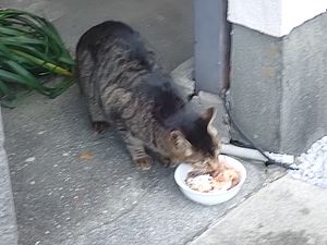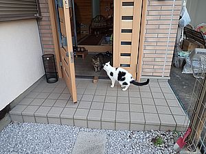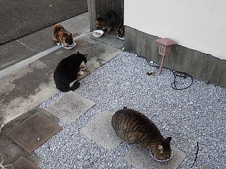 他の猫たちは玄関付近で食べる。元祖黒トラはほとんど食べずに出てきた。