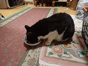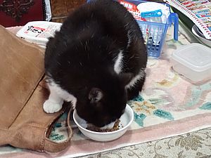 ファントム君は少し離れて個食。まだ黒トラ1号は中で食べている。