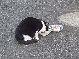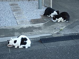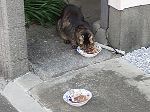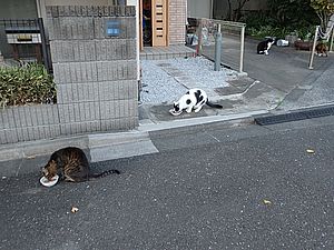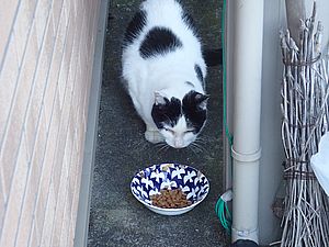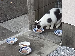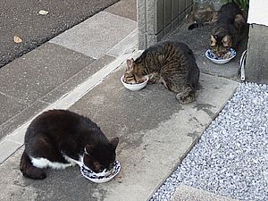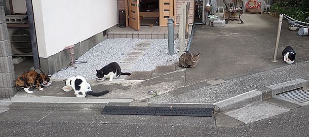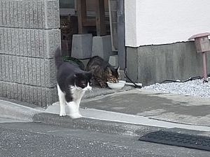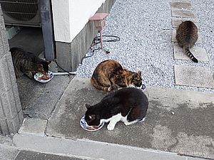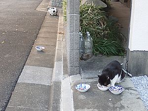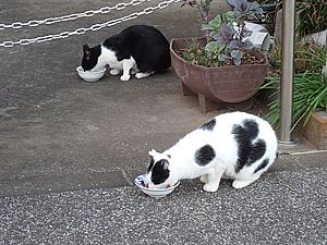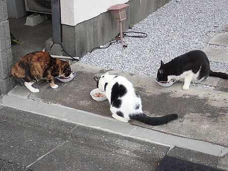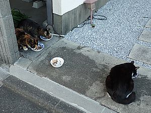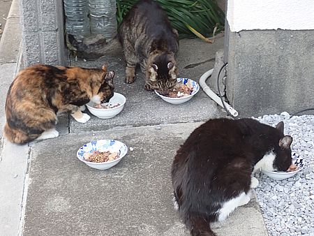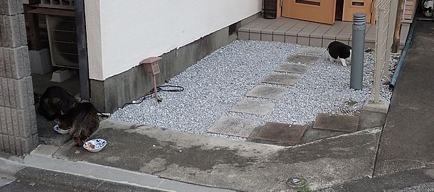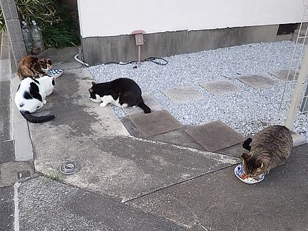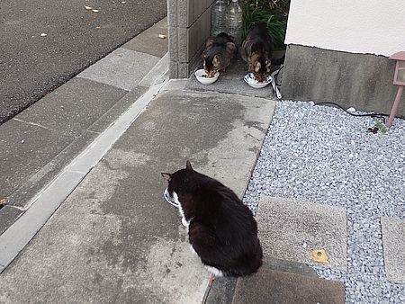 玄関前は黒トラ1号2号が並んで食べる。少し離れてマルハチ君も食べる。