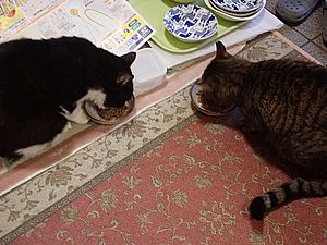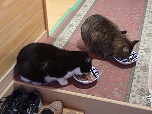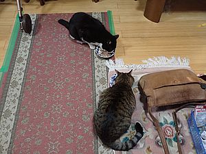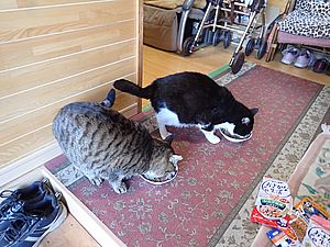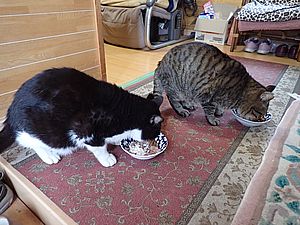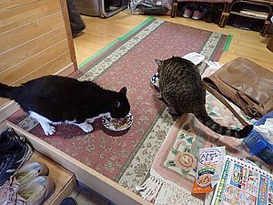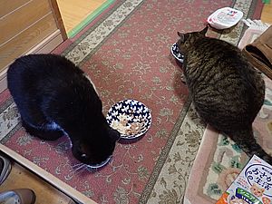 黒トラ1号と元祖黒トラが並んでカリカリを食べている。見ている黒トラ1号に元祖黒トラは迷惑そう。