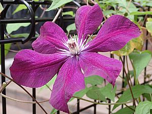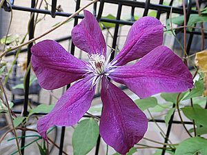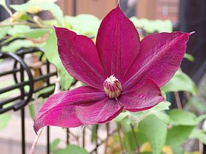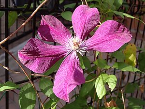 3つの花のうち最初に咲いたクレマチスの花びらが1枚散った。
