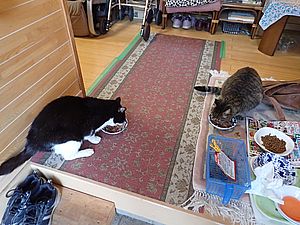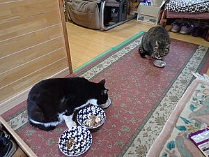 ファントム君は離れて特別食を個食。元祖黒トラは室内で食べている。