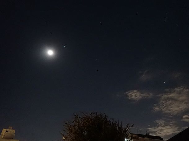 月の左側に見えているのは土星、月の右下にフォーマルハウトが低い位置に見えている。