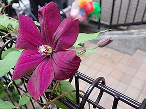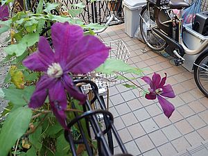 クレマチスの最後のつぼみが開花した。最初の一輪はまだ咲いている。