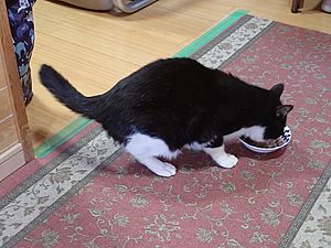 玄関の中まで要求に来たあご黒は指定席で個食。