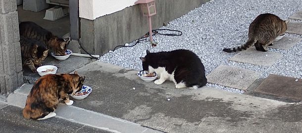 マルハチ君と元祖黒トラはちゅーるを舐め、カリカリを食べていた。今日の出勤は6匹だけだった。